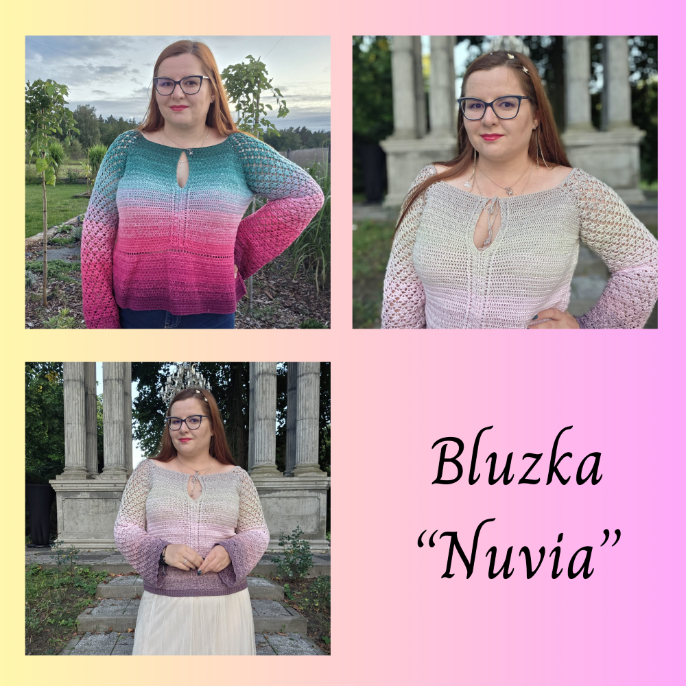 Wzór „Nuvia” to elegancki i kobiecy projekt szydełkowej bluzki, który zachwyca subtelnymi detalami i lekkością wykonania. Charakterystyczne rozcięcie dekoltu nadaje całości wyjątkowego charakteru, a delikatne, ażurowe rękawy sprawiają, że bluzka prezentuje się romantycznie i stylowo.